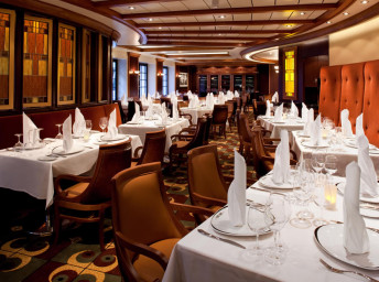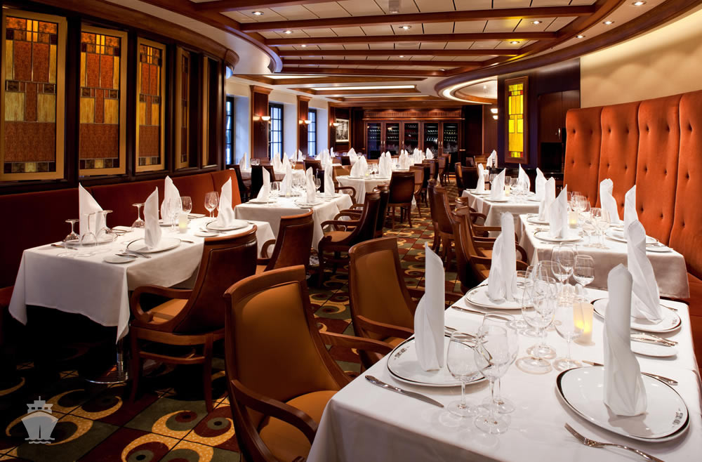 CHOPS GRILLE - klasický americký steakhouse s ručně krájenými steaky v typické restauraci Royal Caribbean s prvotřídním hovězím masem k němuž se přidává  mainský humr, grilované branzino a další šťavnatá jídla v kombinaci s návykovými přílohami a neodolatelnými dezerty.