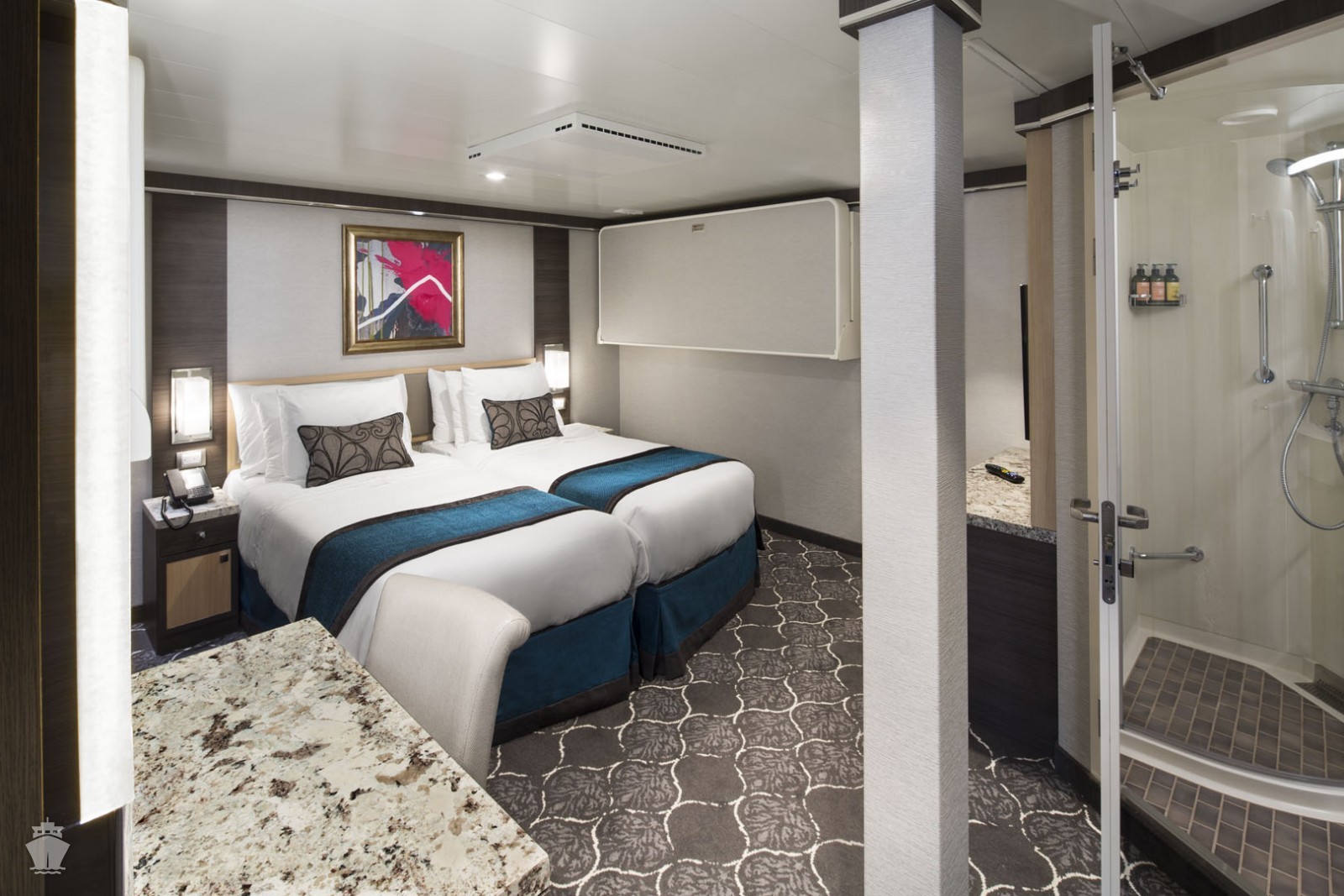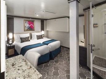Všechny kajuty jsou příjemně zařízené, mají koupelnu se sprchou a WC, dostatek úložných prostor, 2 lůžka (někdy možnost přistýlek), toaletku se zrcadlem a fénem, TV, klimatizaci a trezor.