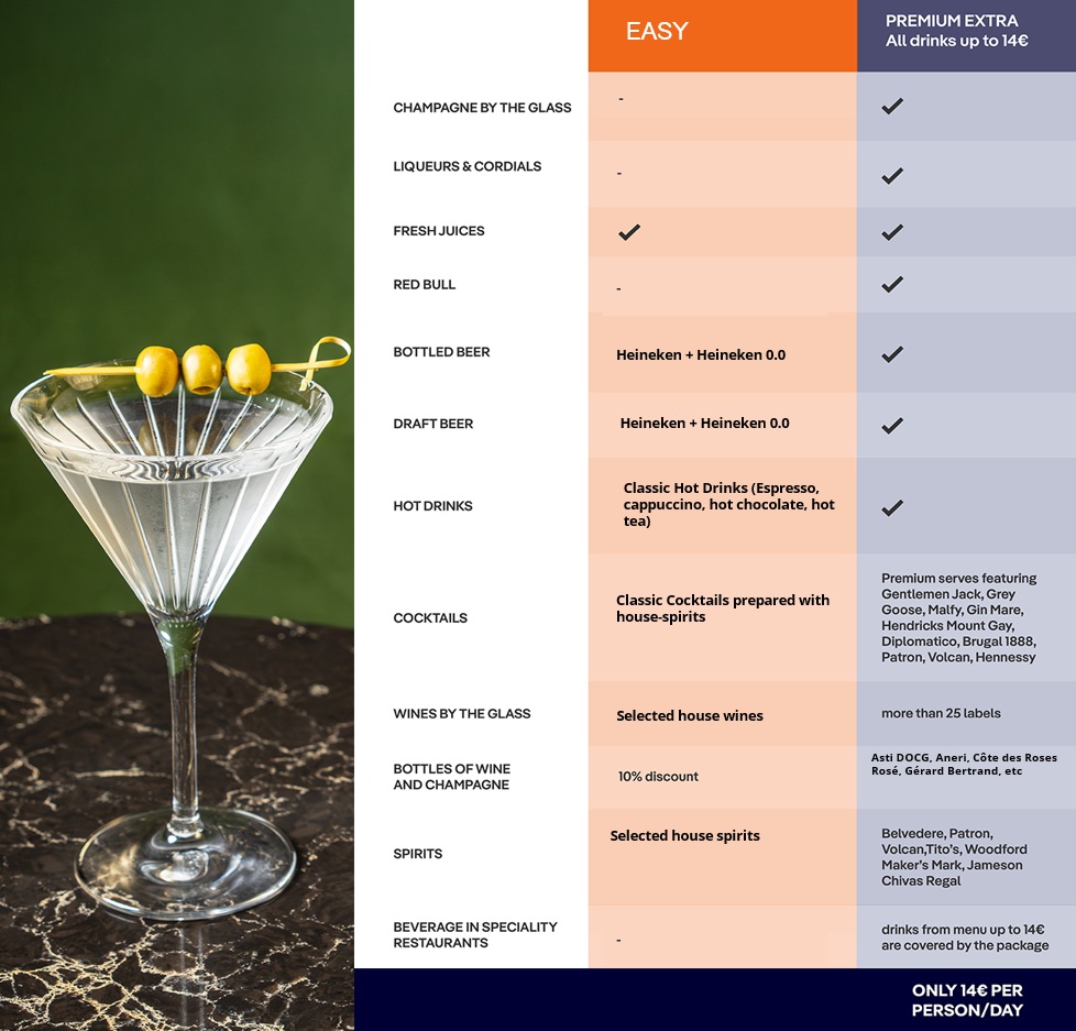 Obsahuje výběr rozlévaných nápojů do ceny 7 EUR / 10 USD: klasických koktejlů, domácích destilátů a míchaných nápojů, nealkoholické koktejly, specializovaný výběr domácích vín, pivo, limonády, ovocné šťávy, balené minerální vody a klasické horké nápoje (espresso, cappuccino, caffe latte, horký čaj).