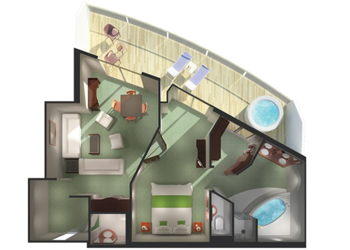 SG - Forward-facing Penthouse 47 m² / balkon 14 m². Vířivka. Výhody Suite. 8. paluba - vpředu. Max 4 osoby. 625 610 Kč 312 805 Kč za osobu