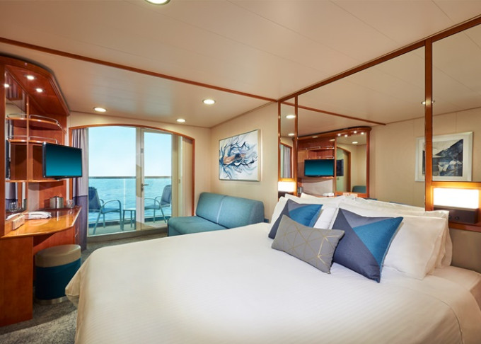 B1 - Kajuta s balkonem Aft-facing 18 m² / balkon 4 m². 8/9/10. paluba - vzadu. Max 3 osoby. 212 771 Kč 106 386 Kč za osobu