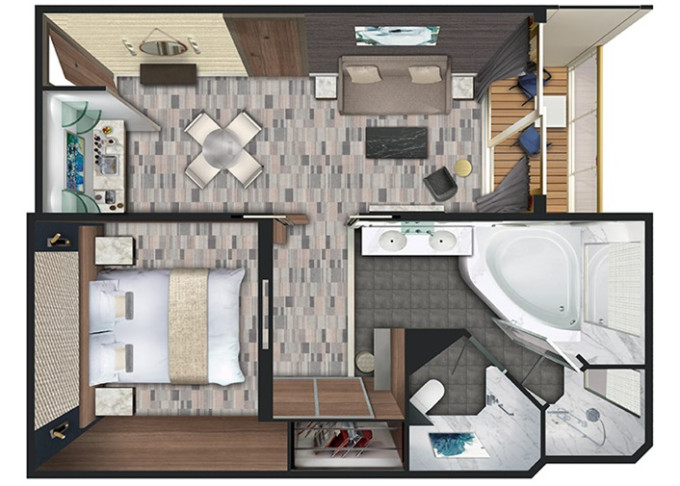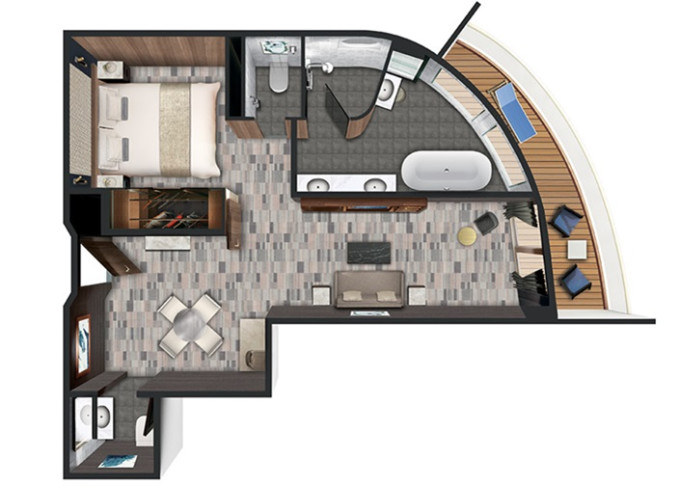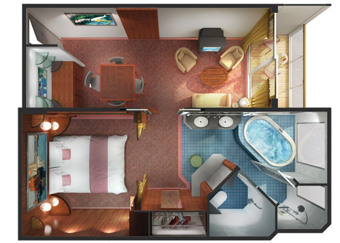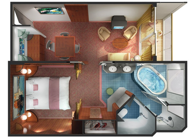| SC - Forward-facing Deluxe Penthouse Suite 52 m² / balkon 11 m². Vířivka. Výhody Suite. 10. paluba - vpředu. Max 3 osoby. | 571 792 Kč 285 896 Kč za osobu |