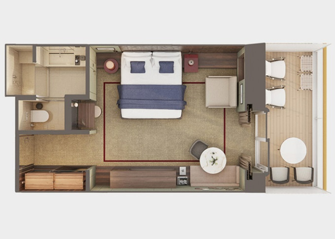 koupelna se sprchou a WC, 2 lůžka, v některých kajutách možnost přistýlek, toaletní stolek, úložné prostory, interaktivní TV, sejf, telefon, vysoušeč vlasů.