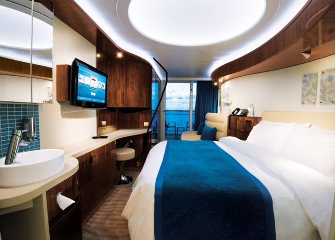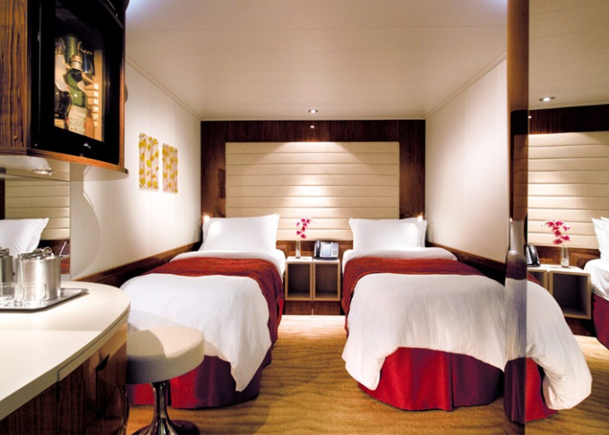 koupelna se sprchou a WC, 2 lůžka, v některých kajutách možnost přistýlek, toaletní stolek, úložné prostory, interaktivní TV, sejf, telefon, vysoušeč vlasů.
