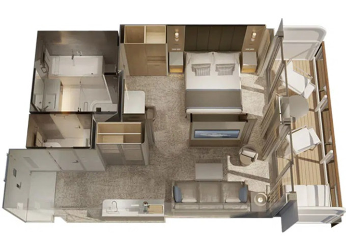 | C1 - Reserve Cabana Mini Suite 30 m² (včetně balkóna a extra lounge). 9. paluba. Výhody Reserve Collection a Výhody Mini Suite. | 187 313 Kč 93 656 Kč za osobu |