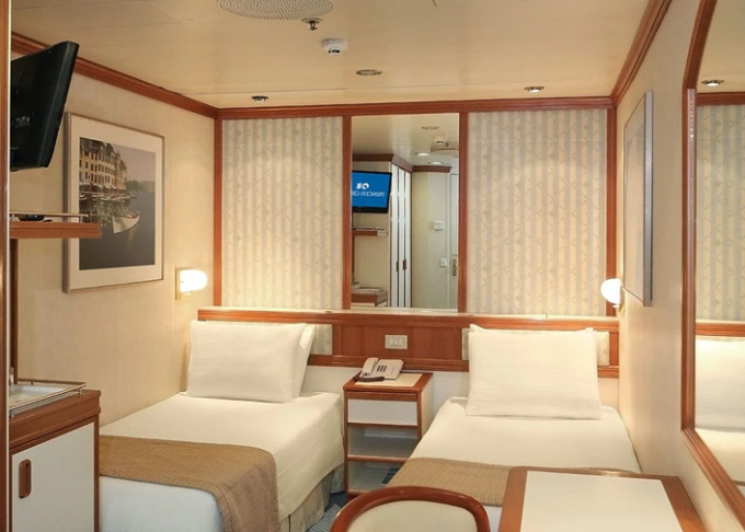 Standardní vybavení kajut: koupelna se sprchou a toaletou, 2 lůžka s možností konfigurace, úložné prostory, minibar, fén, TV, trezor. Balkony je vybaven malým stolkem a 2 židlemi či lehátky.