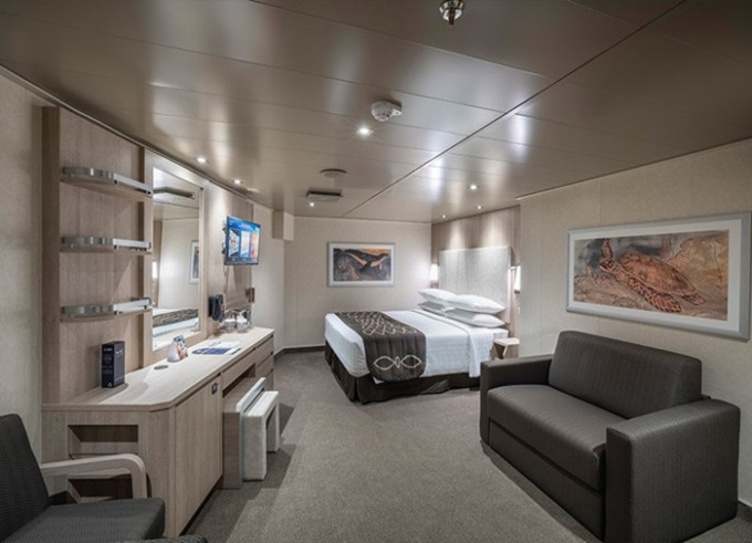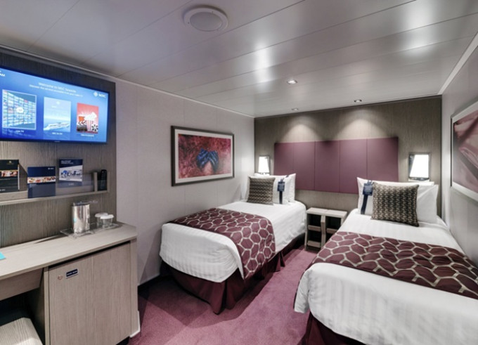 Kajuta vnitřní: 14 - 16 m²; 28 m², kajuta s manželskou postelí (na požádání 2 oddělené postele) a 1-2 vyklápěcí horní lůžka. Klimatizace, koupelna se sprchou a WC, toaletní stolek, skříň, interaktivní TV, sejf, telefon, vysoušeč vlasů, virtuální asistentka ZOE.
