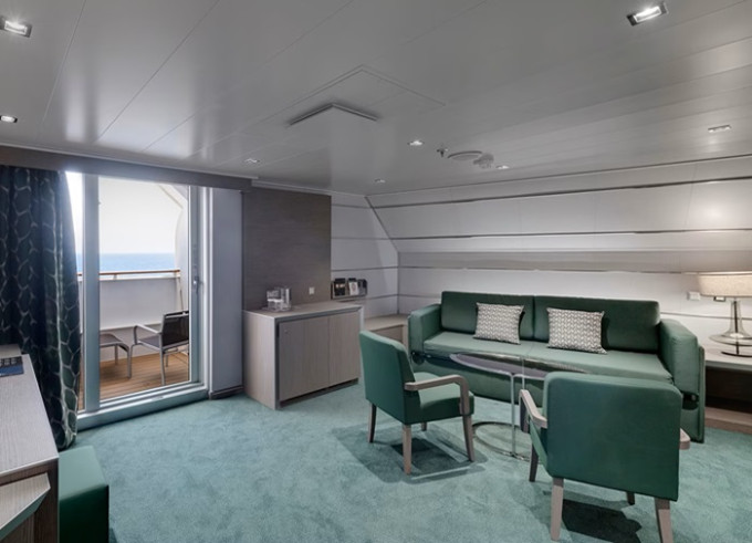 Kajuta s balkónem: 16 -17 m², kajuta s manželskou postelí (na požádání 2 oddělené postele) a rozkládací pohovka. Klimatizace, koupelna se sprchou nebo vanou a WC, toaletní stolek, prostorná skříň, interaktivní TV, telefon, sejf, vysoušeč vlasů, virtuální asistentka ZOE. Balkony se stolkem a židlemi. Některé kajuty mají omezený výhled.