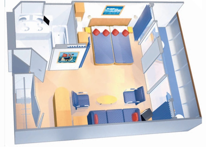 | 1K - Velká vnější kajuta Ultra Spacious 24,5 m². Neotevíratelné okno. 7/8. paluba. Max. 6 osob. | 95 432 Kč 23 858 Kč za osobu |