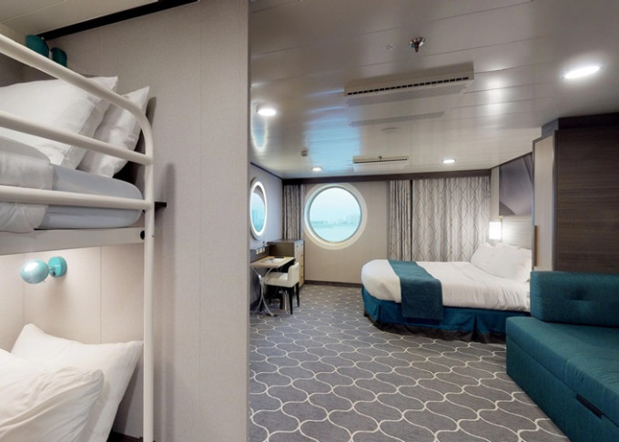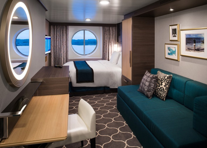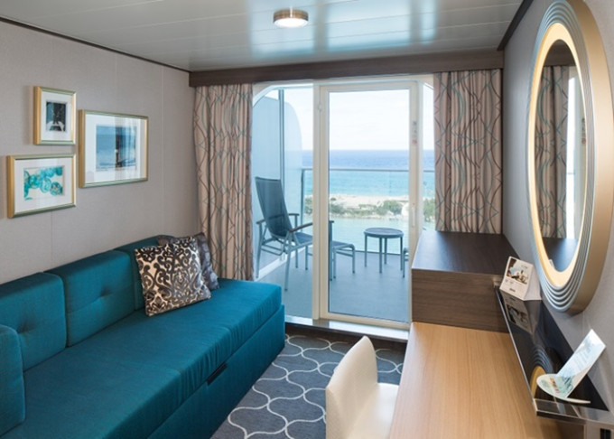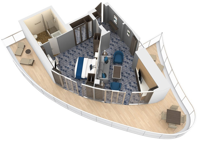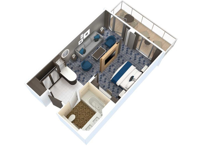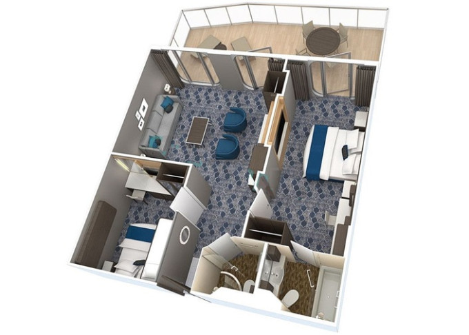 J4 - Junior Suite s balkonem 26,5 m² / balkon 7,5 m². Výhody Royal Suite Class. 6. až 14. paluba. Max 5 osob. 178 685 Kč 178 685 Kč za osobu