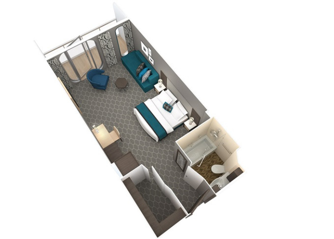 2T - Vnitřní kajuta Promenade View / s oknem 18 m². Neotevíratelné okno (výhled na Promenade). 7. paluba. Max 4 osoby. 63 096 Kč 21 032 Kč za osobu