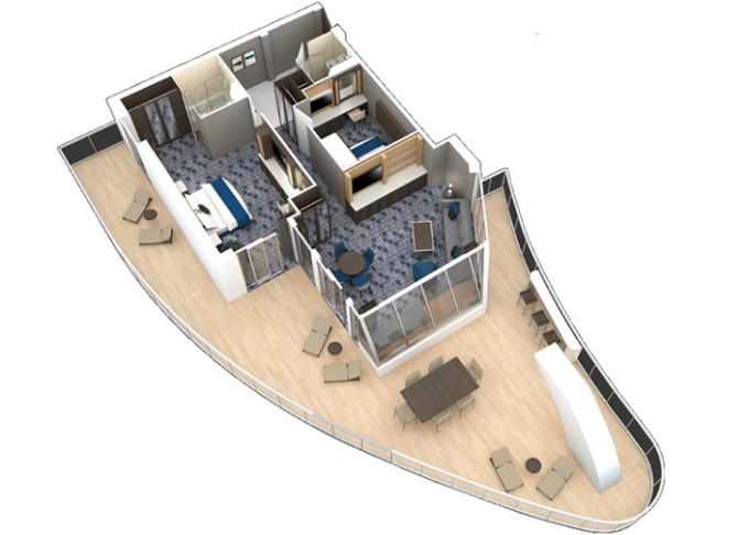 A2 - Spacious AquaTheater Suite s balkonem / 2 ložnice 62,5 m² / balkon 56 m². Výhody Royal Suite Class. 9/10. paluba. Max 8 osob. 525 477 Kč 262 738 Kč za osobu