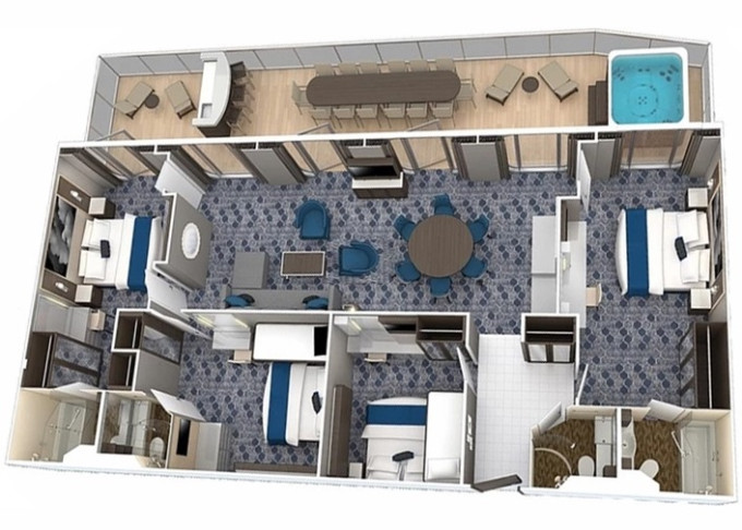 US - Ultimate Family Suite 106 m² / balkon s vířivkou 20 m². Výhody Royal Suite Class. 2 podlaží. Stolní hokej a stolní tenis, sklouzavka 3D kino, videokonzoly. 17. paluba. Max 6 osob. 648 568 Kč 324 284 Kč za osobu