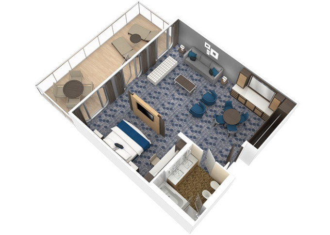 J3 - Junior Suite s balkonem 26,5 m² / balkon 7,5 m². Výhody Royal Suite Class. 6/7/8/14. paluba. Max 5 osob. 181 661 Kč 181 661 Kč za osobu