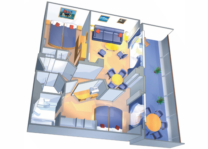 | GT - Grand Suite s balkonem / 2 ložnice 57 m² / balkon 19 m². Výhody Royal Suite Class. 8/9. paluba. Max 8 osob. | 133 020 Kč 44 340 Kč za osobu | ||