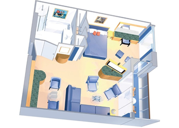 | VP - Ocean View Panoramic Suite (bez balkonu) 37 m². Panoramatické neotevíratelné okna. Výhody Royal Suite Class. 12. paluba. Max 6 osob. | 80 577 Kč 26 859 Kč za osobu |