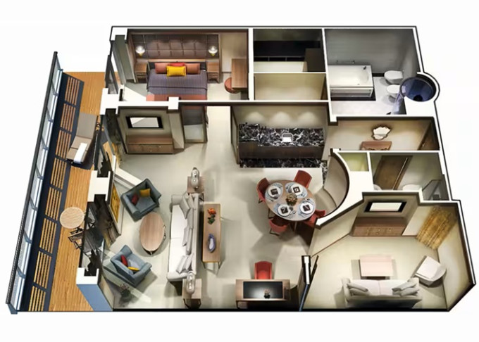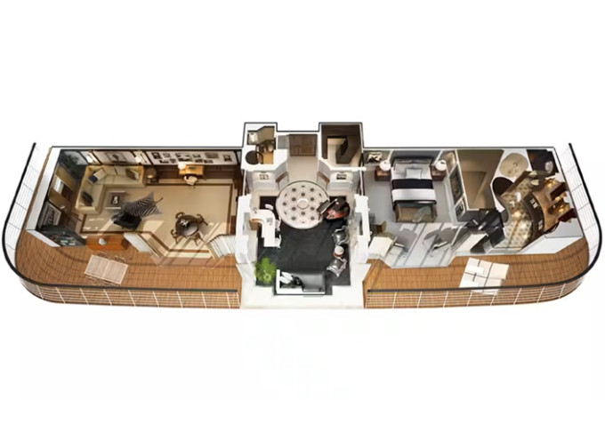 OS - Owner’s Suite 123 m² + balkon s vířivkou od 62 m². Výhody Owners Suite. 8/9/10. paluba. Max 2-3 osoby. 4 izby: vstupná hala s pianom, ložnice, velká obývací místnost s jídelní částí, 2 koupelny (1 s vířivkou), 2 šatníky. 1 274 378 Kč 637 189 Kč za osobu