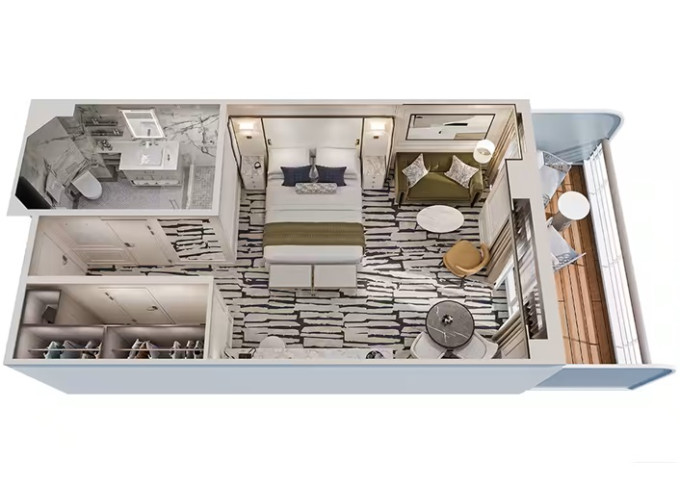 A1 - Kajuta s balkonem Concierge 23 m² + balkon 4 m². Výhody kategorie Concierge. 10/11/12. paluba. Max 2-3 osoby. 525 627 Kč 262 813 Kč za osobu