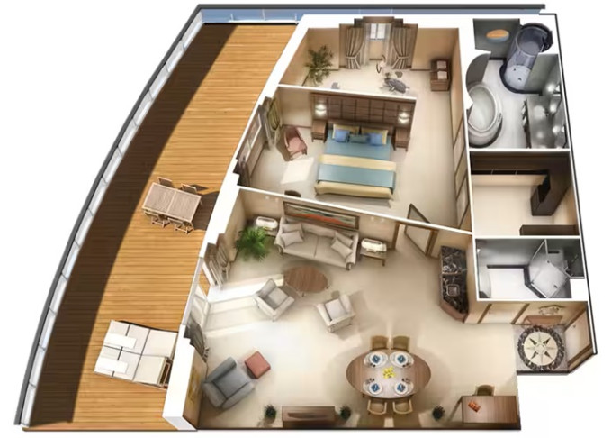VS - Vista Suite od 87 m² + balkon s vířivkou od 24 m². Výhody Vista Suite. 8/9/10. paluba. Max 2-3 osoby. 3 izby: ložnice, velká obývací místnost s jídelní částí, zařízená fitness místnost, 2 koupelny (1 s vířivkou), šatník. 952 270 Kč 476 135 Kč za osobu