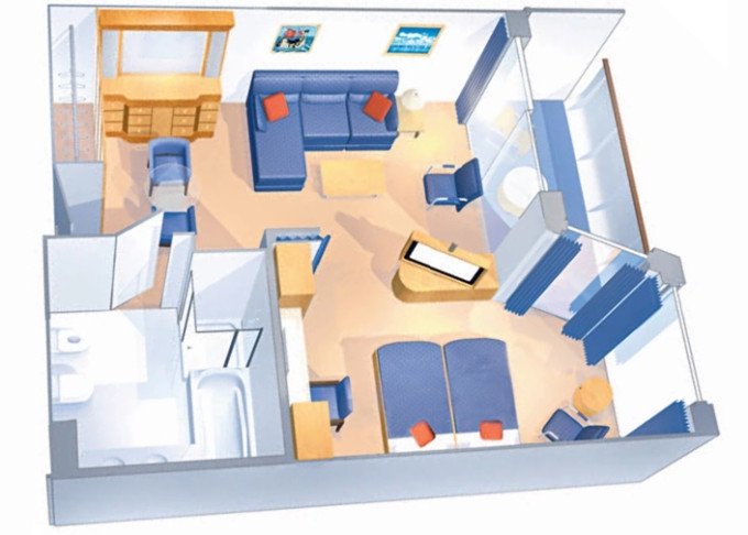 J3 - Junior Suite s balkonem 28 m² / balkon 6 m². Výhody Royal Suite Class. 10. paluba. Max 4 osoby. 52 518 Kč 52 518 Kč za osobu