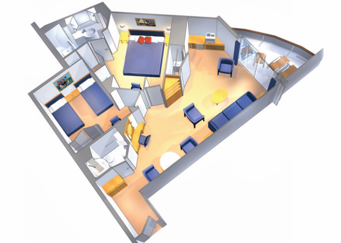 OT - Owner´s Suite s balkonem / 2 ložnice 54 m² / balkon 14 m². Výhody Royal Suite Class. 7. až 10. paluba. Max 8 osob. 98 633 Kč 24 658 Kč za osobu