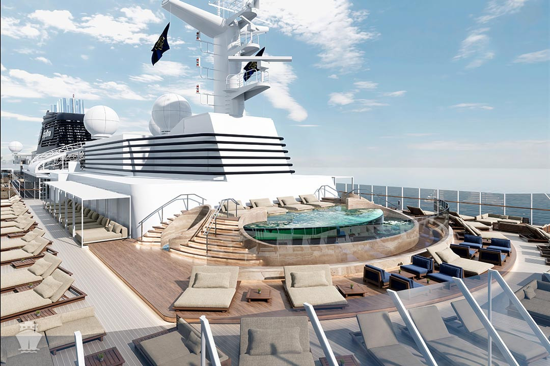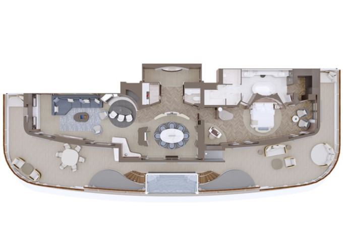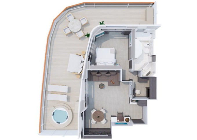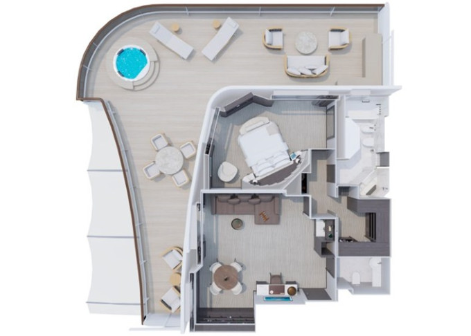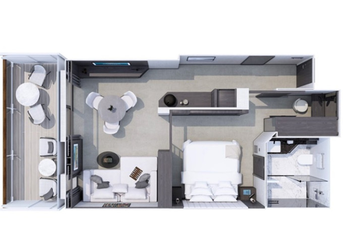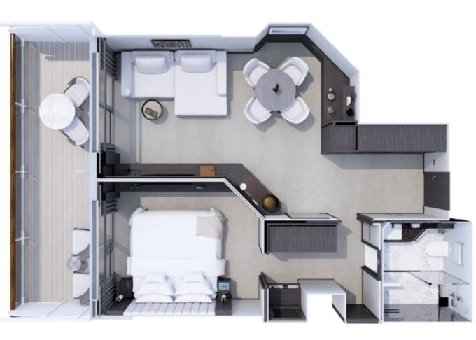 Ubytování na lodi v celkovém počtu 461 apartmá s vlastním balkonem či terasou je rozdělené do 3 základních třích: