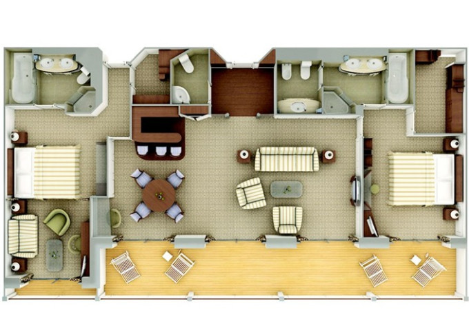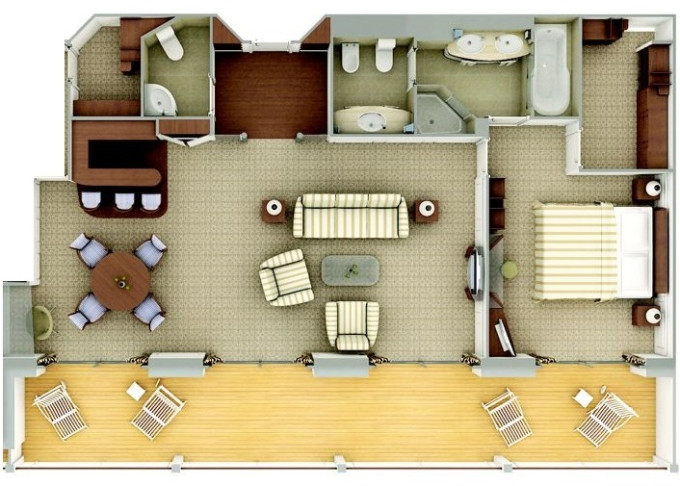 | SL - Silver Suite 61-65 m² (včetně verandy). Ložnice, oddělená obývací časť a jídelní část, vírívka. | 637 714 Kč 212 571 Kč za osobu | ||