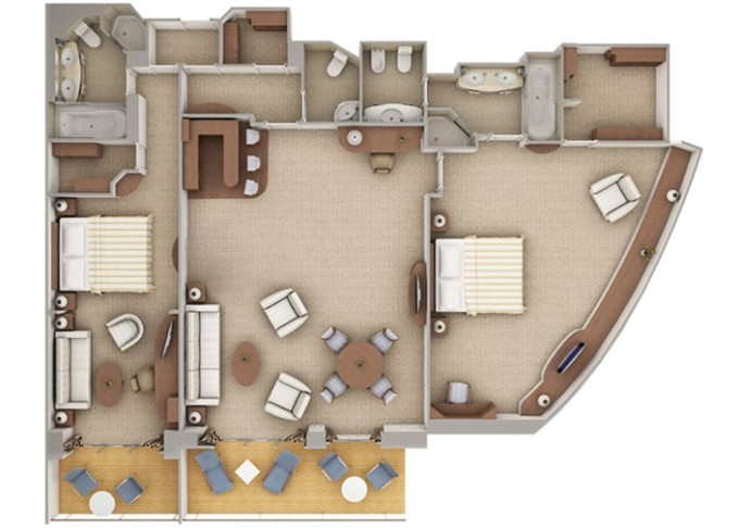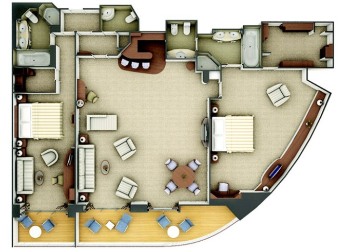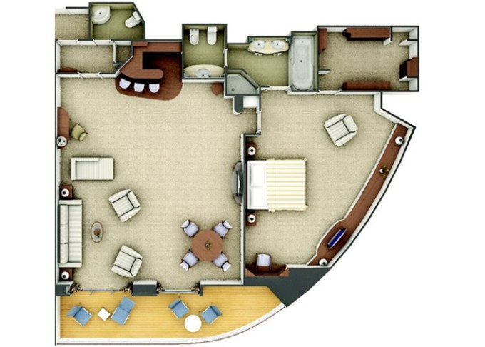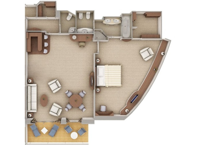 | O1 - Owner's Suite 1 85 m² (včetně balkonu). Ložnice, oddělená obývací část a jídelní část, vírívka. | 865 291 Kč 432 645 Kč za osobu | ||