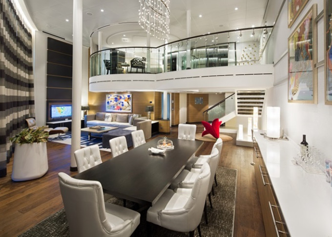 RL - Royal Loft Suite s balkonem 152 m² / balkon 51 m². Výhody Royal Suite Class. 2-podlažní apartmán. 8. paluba. Max 6 osob. 765 907 Kč 382 954 Kč za osobu
