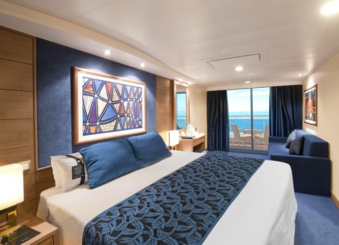 Suite s balkónem: cca 31 m², kajuta s manželskou postelí (na požádání 2 oddělené postele) a rozkládací pohovka. Klimatizace, koupelna s vanou a WC, toaletní stolek, prostorná skříň, interaktivní TV, telefon, minibar, sejf, vysoušeč vlasů. Balkon se stolkem a židlemi.