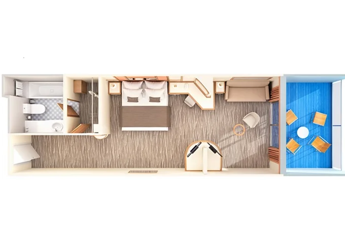 | 8B - Kajuta s balkonem 21,5 - 25,5 m² (včetně balkonu). 10. a 11. paluba. | 56 119 Kč 28 059 Kč za osobu |
