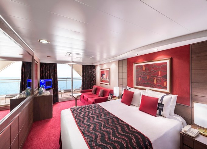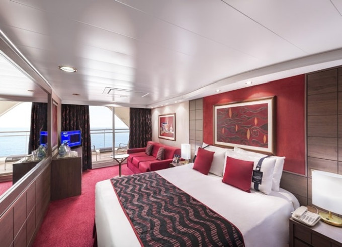 Suite s balkónem: cca 31 m², kajuta s manželskou postelí (na požádání 2 oddělené postele) a rozkládací pohovka. Klimatizace, koupelna s vanou a WC, toaletní stolek, prostorná skříň, interaktivní TV, telefon, minibar, sejf, vysoušeč vlasů. Balkon se stolkem a židlemi.