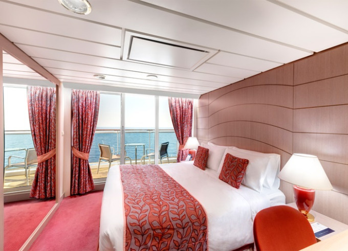 Kajuta s balkónem: 15 - 16 m², kajuta s manželskou postelí (na požádání 2 oddělené postele) a rozkládací pohovka. Klimatizace, koupelna se sprchou nebo vanou a WC, toaletní stolek, prostorná skříň, interaktivní TV, telefon, minibar, sejf, vysoušeč vlasů. Balkony se stolkem a židlemi.