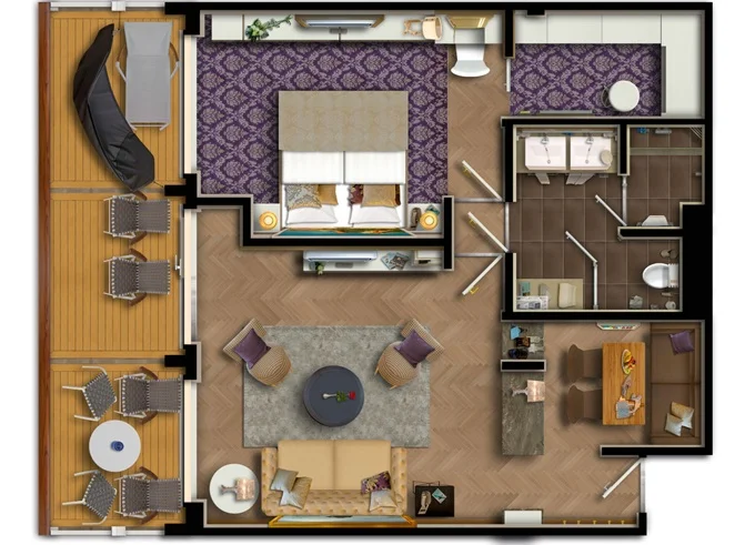 | SUTO - Themen Suite 54 m² + balkon 15 m² se stolem, lehátkom a houpací sítí. Ložnice, Obývací část, šatník. 10. paluba. Max 4 osoby. Výhody Suite. | 455 553 Kč 113 888 Kč za osobu | ||