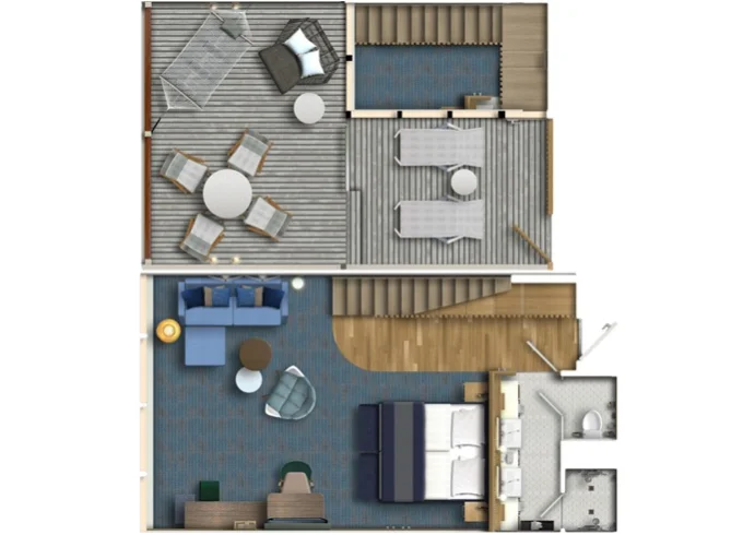 SUHO - Himmel & Meer Suite 42 m² + prekrytá terasa 29 m² v patře se stolem, lehátky a s houpací sítí. Ložnice s obývací částí a jedálenským kútom. 15. paluba. Max 4 osoby. Výhody Suite. 187 513 Kč 93 756 Kč za osobu