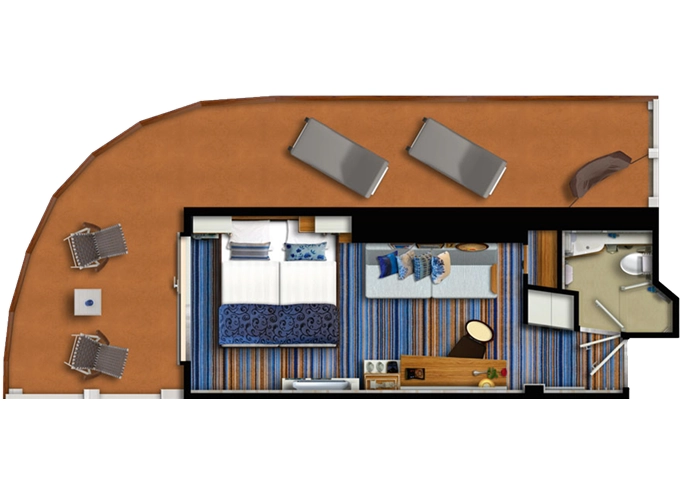 VEPO - Kajuta s terasou Premium 17 m² + balkon 30 m² s 2 kreslami, 2 lehátky a houpací sítí. 7-11. paluba. Max 3 osoby. 215 122 Kč 215 122 Kč za osobu